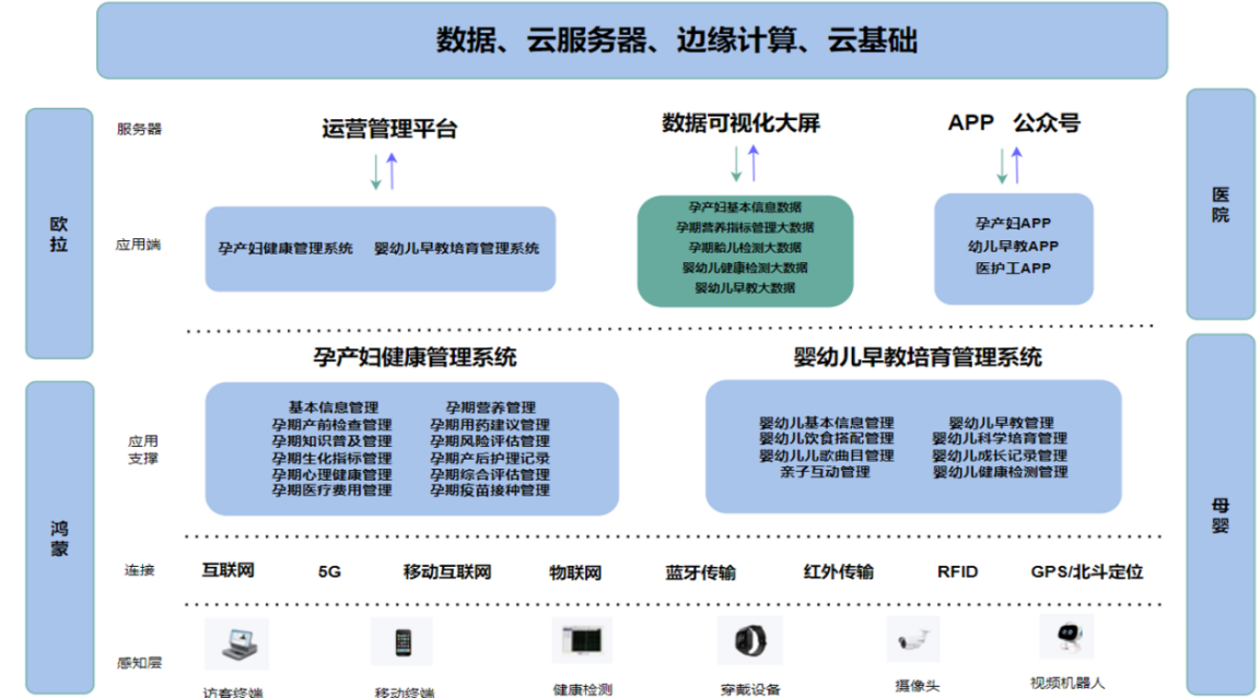 该平台主要包括两大系统,孕产妇管理系统和婴幼儿管理系统。其基于鸿蒙系统的分布式架构和微内核设计实现医院设备与机器人设备之间的互联互通和数据共享,提高育婴软件系统功能中医院数据和母婴数据的安全性和稳定性。鸿蒙系统具备自适应能力、高效性、安全性,能够根据不同用户和医院的需求智能调配系统资源,给予快速启动和敏捷响应,采取多层次安全防护措施,更加注重保护母婴和医院数据隐私。同时,利用华为欧拉系统,平台具备高效的性能优化、强大的可维护性和广泛的适用性,可以支持多种硬件平台和软件应用,且快速定位和修复系统中的故障和异常情况。
